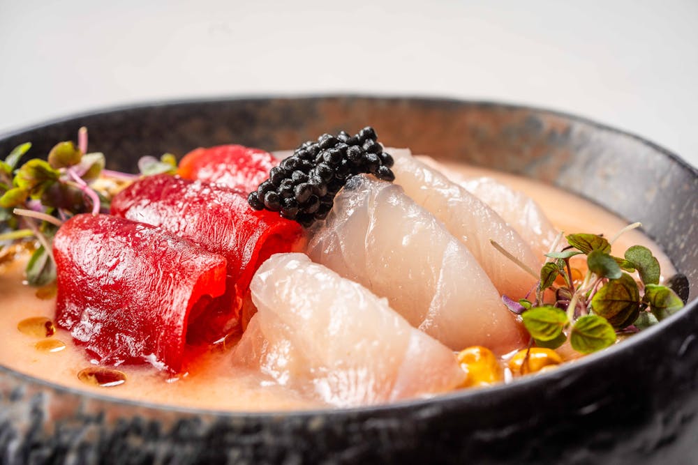 The Baja Trio is a visual and flavorful delight. Featuring a trio of seafood sensations, it combines bluefin, striped bass, and shrimp, harmonized with red onion and rocoto leche de tigre. The vibrant colors of this dish are nothing short of a masterpiece.